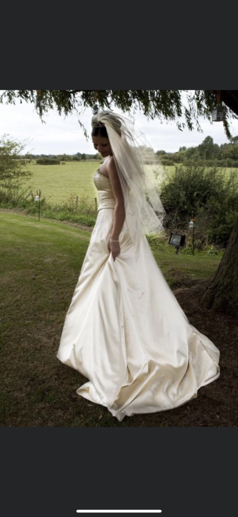 Alan Hannah strapless bodice, with full A-line skirt. In beautiful soft slipper satin, lovely train, Swarovski crystals and small gold bead edge the edge of the bodice, fastens with tiny satin buttons.