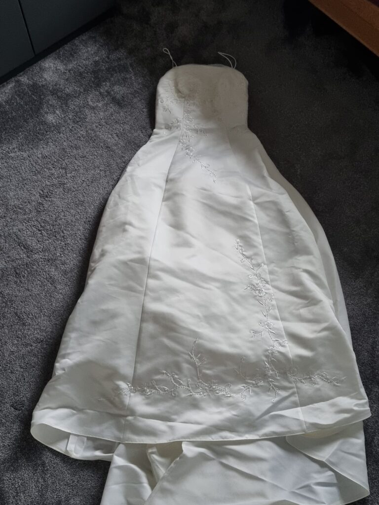Mint condition strapless wedding dress, size 6-8. Worn once and professionally cleaned immediately after use. Boned bodice with zip fastening at the back. Train can be looped up when being worn to save carrying it. Beautiful flower and crystal bead detailing, optional straps.