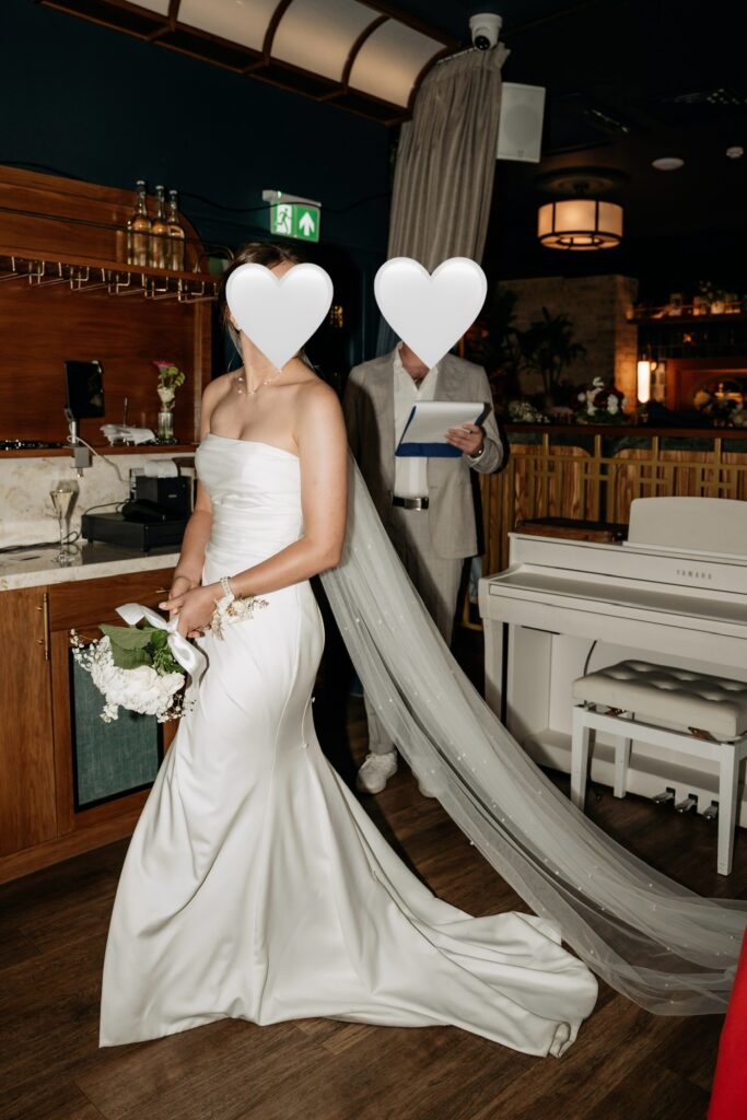This is a mermaid silhouette dress in ivory colour. The corset of the dress is made with a curly neckline. The back of the corset is concave. The top is completely decorated with a drape of costume fabric, which adds volume to the décolleté area and emphasises the elegant waist. The clasp on the back of the corset is on the expander hooks. The skirt of the dress is close-fitting in the hip area, with an extension downwards, and features a slit on the right leg. The skirt is made of costume fabric, with a small train. Diagonal pleats, starting from the side seam, are created in the upper part of the front panel of the skirt. The closure of the skirt is a hidden zipper.