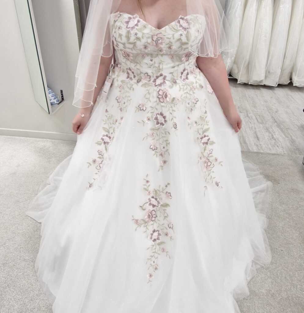 Beautiful ivory, floral patterned wedding dress. Floor length. Flowers up the back of the dress, glittery top layer to the dress also. Feel free to ask for other photos.