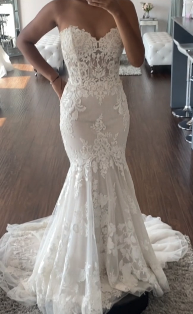 This was bought but never worn or even altered so it’s completely new and unworn with tags still on. It even comes with a matching veil which is floor length and has matching lace. https://justinalexander.com/justin-alexander-signature/wedding-accessories/99007V/