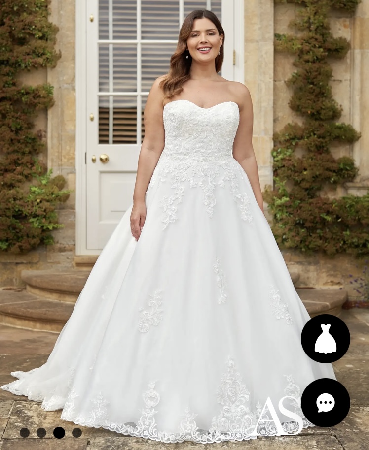 Stunning Strapless A-line Anna Sorrano ‘Florencia’ designer wedding dress features a modern dipped neckline and traditional lace-up back. Ornate embroidered lace contours the bodice before flowing into a classic tulle A-line skirt, finished with a scalloped lace hem and beautiful train.