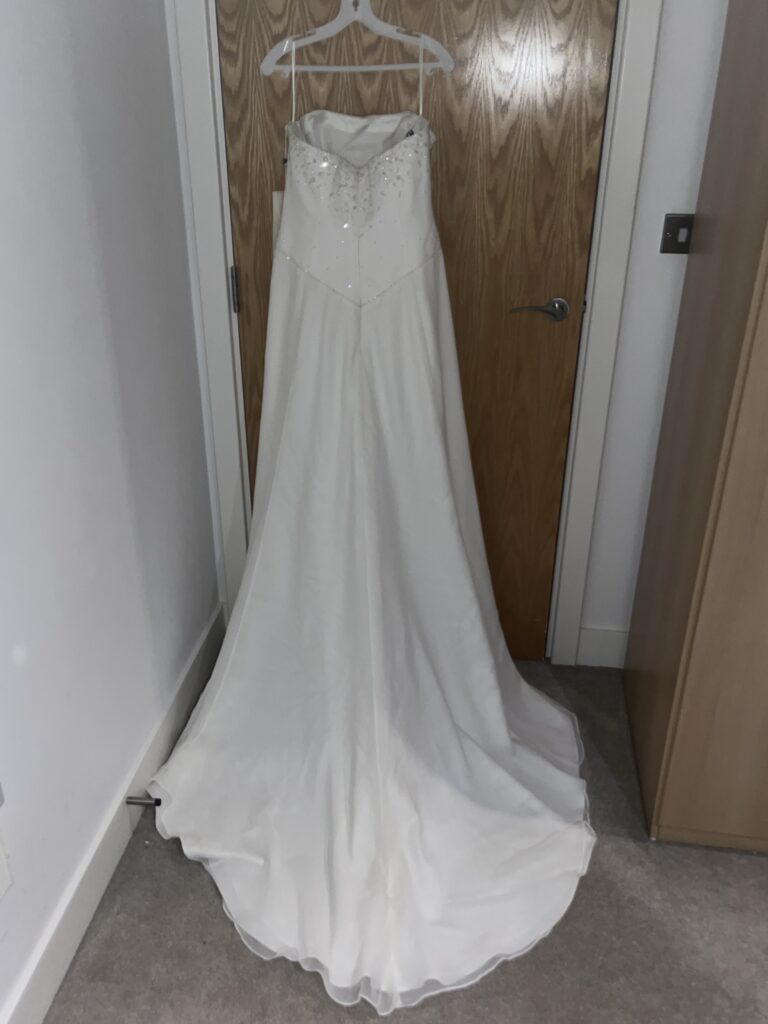 Gorgeous ivory wedding dress in size 16. Beautiful detailing. Never worn. Complete with plastic cover.